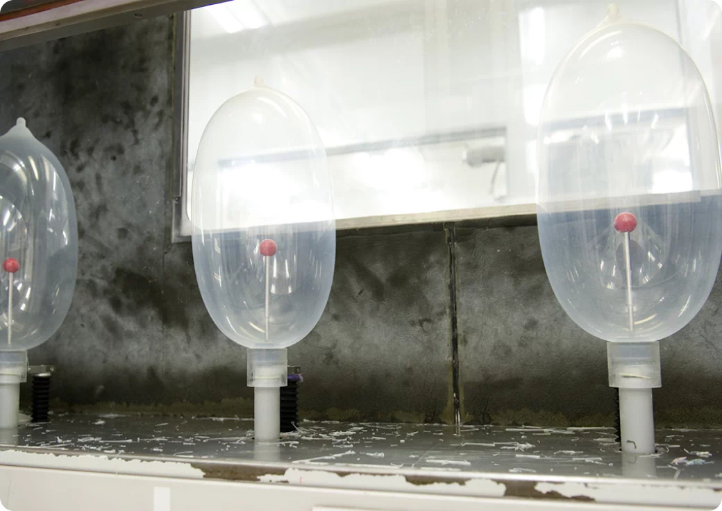 コンドームにピンホール(微細な穴)がないかどうかを確認する試験です。 コンドームに 水を入れ、一定時間放置して水がしみ出さないかどうかを目視でチェックします。同時にコンドームの形状に偏りがないかも確認しています。