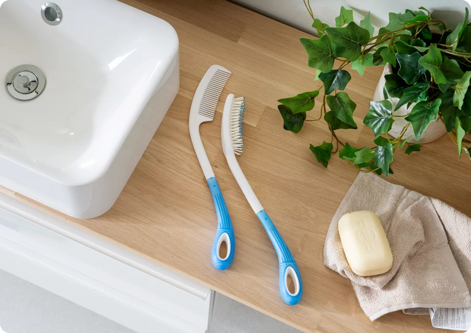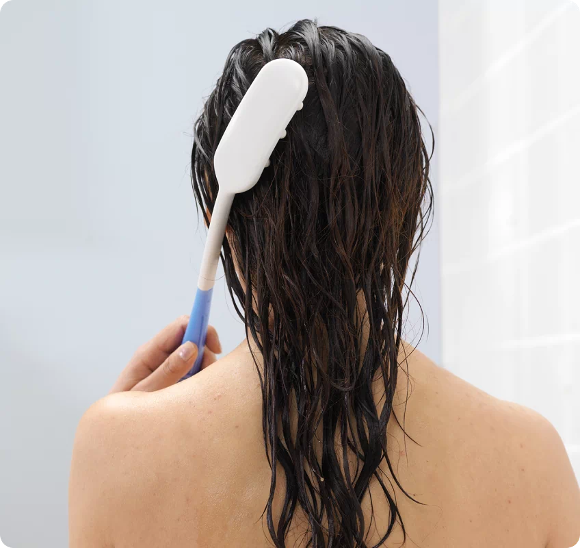 肩や手の動きに合わせて選べる、長さの異なる2種類をご用意しました。先端は頭の形にフィットするカーブデザインで、柄を体に近づけたまま無理なく髪をとかせる工夫がされています。