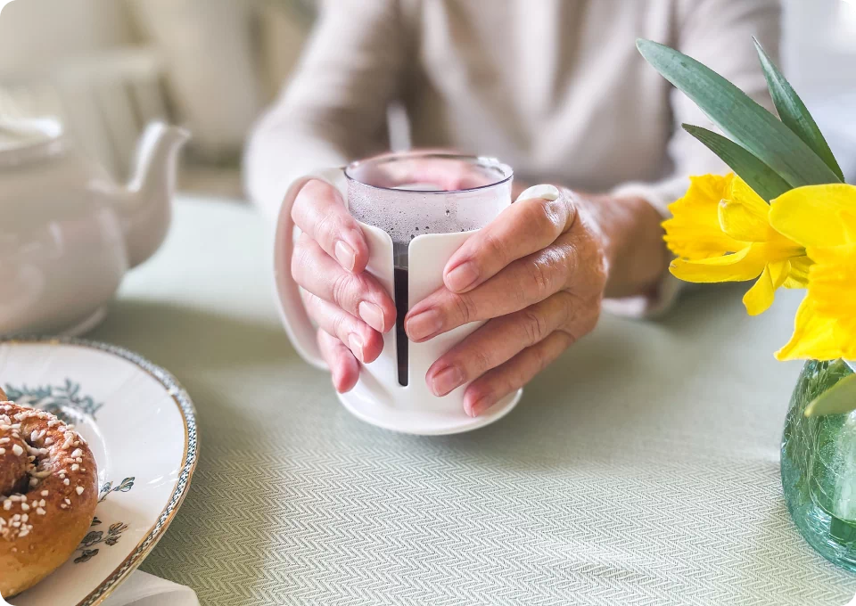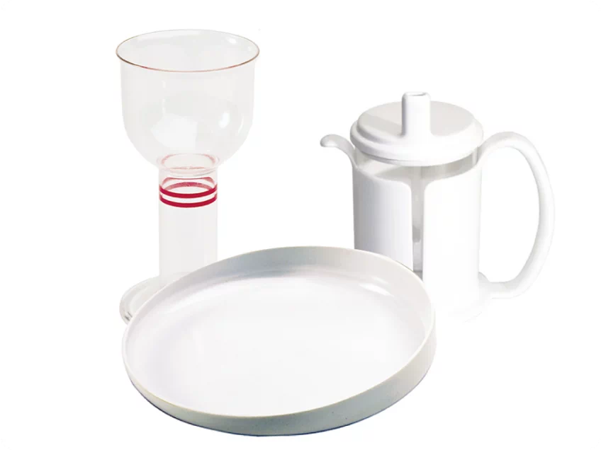 持ちやすさと使いやすさを追求した食器シリーズです。握りやすい設計のグラス、手を差し込むだけで持ち上げられるコップ、食べ物をすくいやすい高低差のある皿(滑り止め付き)をご用意しました。