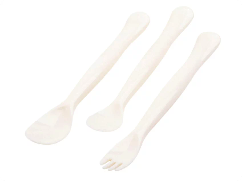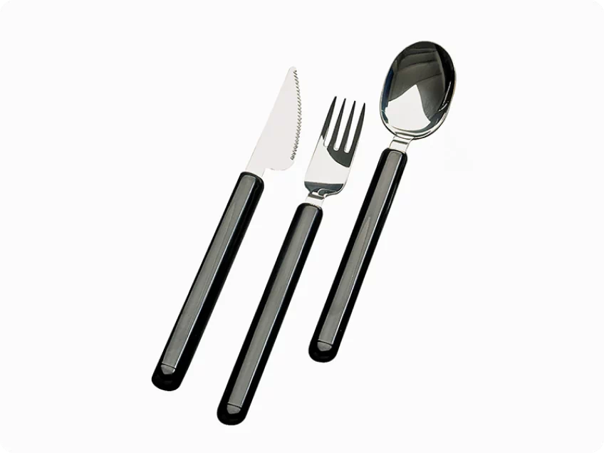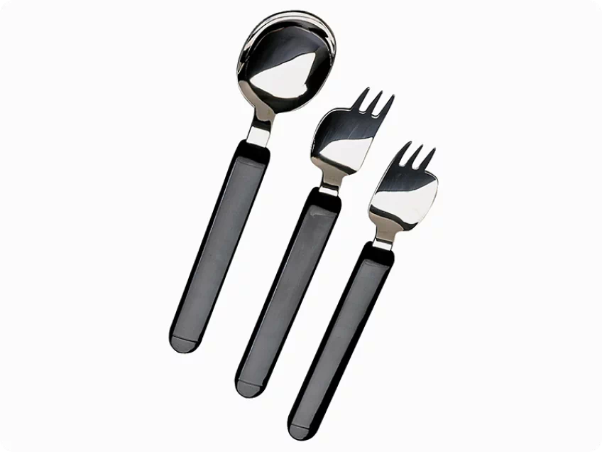 ナイフの機能もいっしょに備えたスプーンとフォークです。切る動作も片手で行うことが出来ます。
