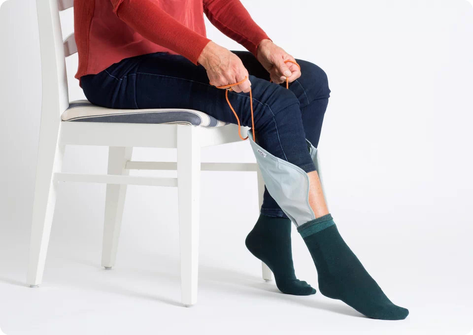 靴下やストッキングをかぶせて足を差し込み、紐を引き上げるだけで、前傾姿勢をとらずに靴下やストッキングをはくことができます。
