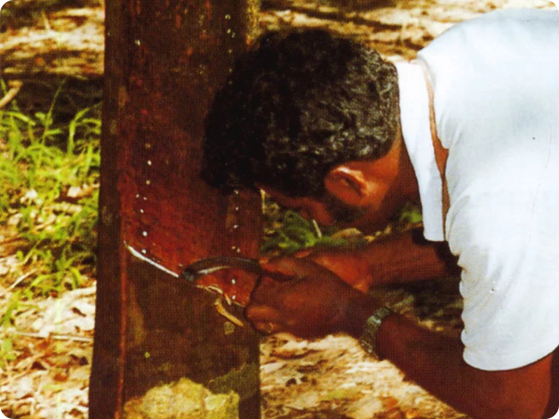 As shown in the photo, diagonal cuts are made in the bark of rubber trees to collect the sap as it flows out.