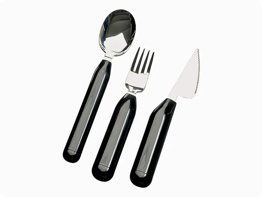 ナイフの機能もいっしょに備えたスプーンとフォークです。切る動作も片手で行うことが出来ます。