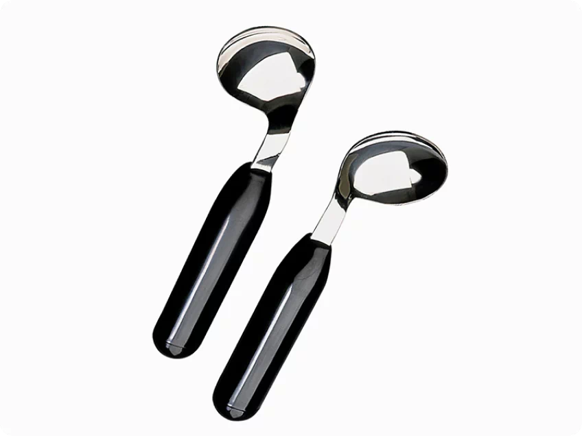 介護をする方の負担を軽減するために開発された、柄の長いスプーンとフォークです。サポートする側のための設計になっています。
