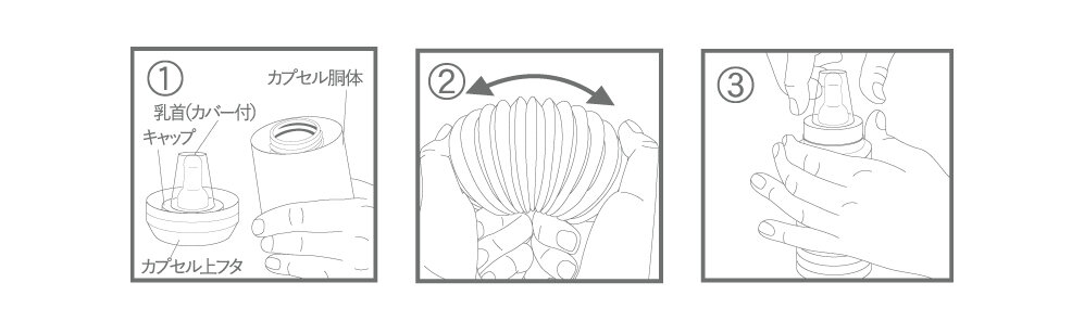 イラストのように扇状に伸ばすと、 スムーズに広げられます。③ボトルに用意した粉ミルクとお湯を注ぎ、 カプセル上フタからキャップを取り外し、 ボトルにしっかり取り付けます。